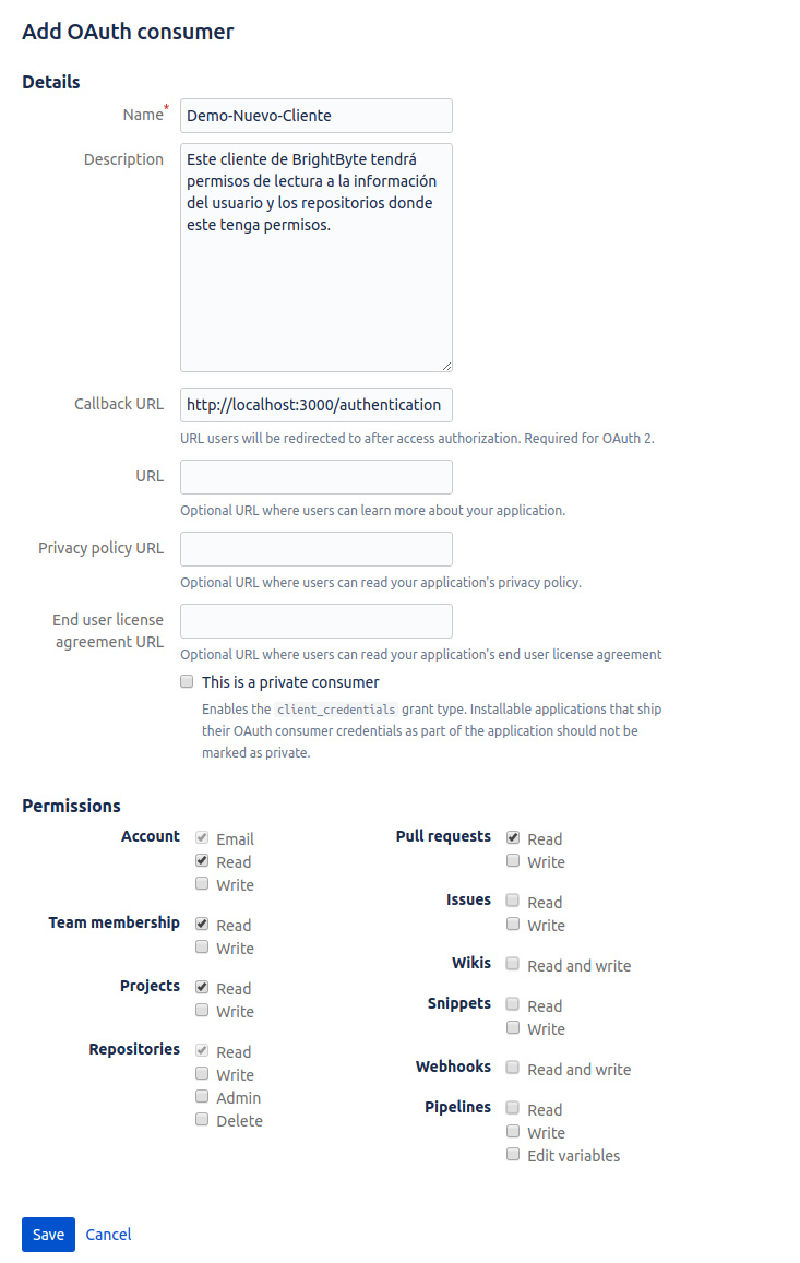 El primer paso a realizar es registrar nuestro propio cliente de Bitbucket, donde especificaremos el nombre de nuestro proyecto y el «callback» donde queremos que Bitbucket nos devuelva el «token» de autenticación, que nos permitirá realizar la peticiones de lectura de los repositorios del usuario, como se muestra a continuación.