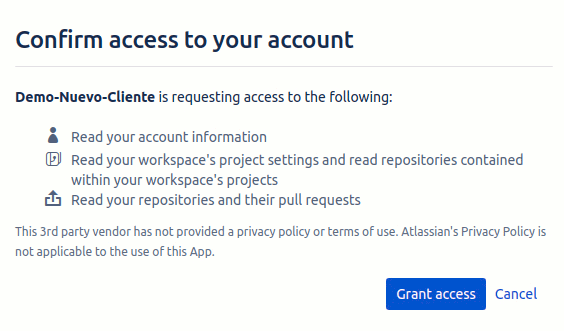 Ya podemos disfrutar de la integración con Bitbucket. Cuando un usuario se autentifica podrá ver todos los permisos que da al sistema para gestionar su información. Es importante recordar que el sistema sólo tendrá permisos de lectura a los repositorios en los que participa el usuario. Repetimos: en ningún momento el sistema tiene acceso al código fuente de los repositorios.