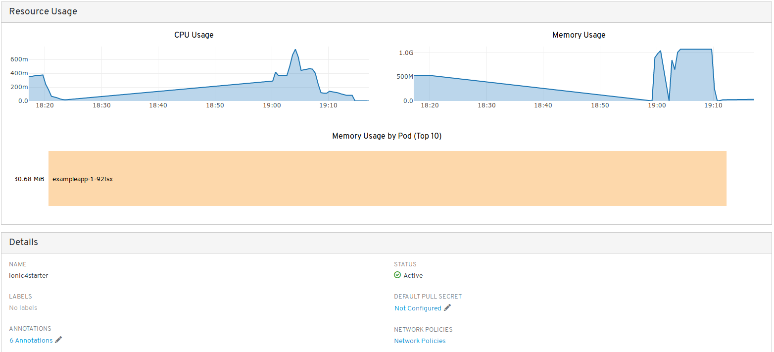 Puedes consultar el estado de tu contenedor en Workloads -> Pods -> exampleapp-1… y las estadísticas del proyecto en Home -> Status -> Project: ionic4starter -> Dashboard.
