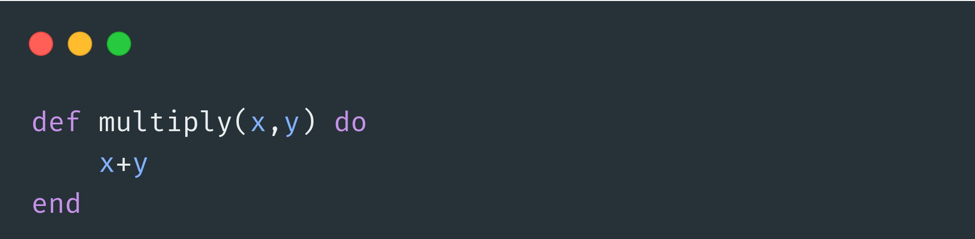 La palabra reservada def es como la palabra reservada function en otros lenguajes, a continuación va el nombre de la función, y las palabras do y end definen el scope de la función. Tan solo acabamos de empezar y ya podemos ver algo interesante, no hay un return al final de la función para devolver el resultado.