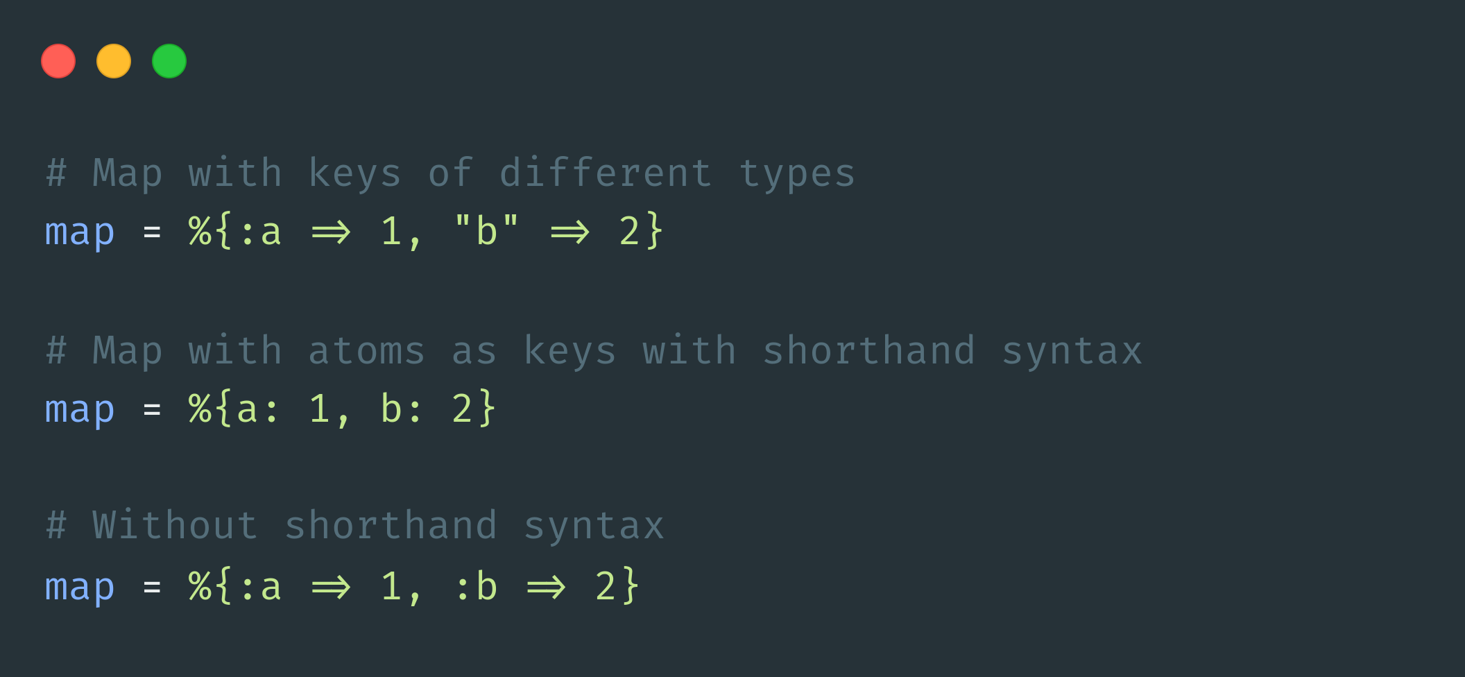 Los mapas de Elixir son como los mapas de Java. Tienen la particularidad de que si todas las claves del mapa son átomos (lo cual es recomendable), se puede utilizar una sintaxis especial para simplificarlos.