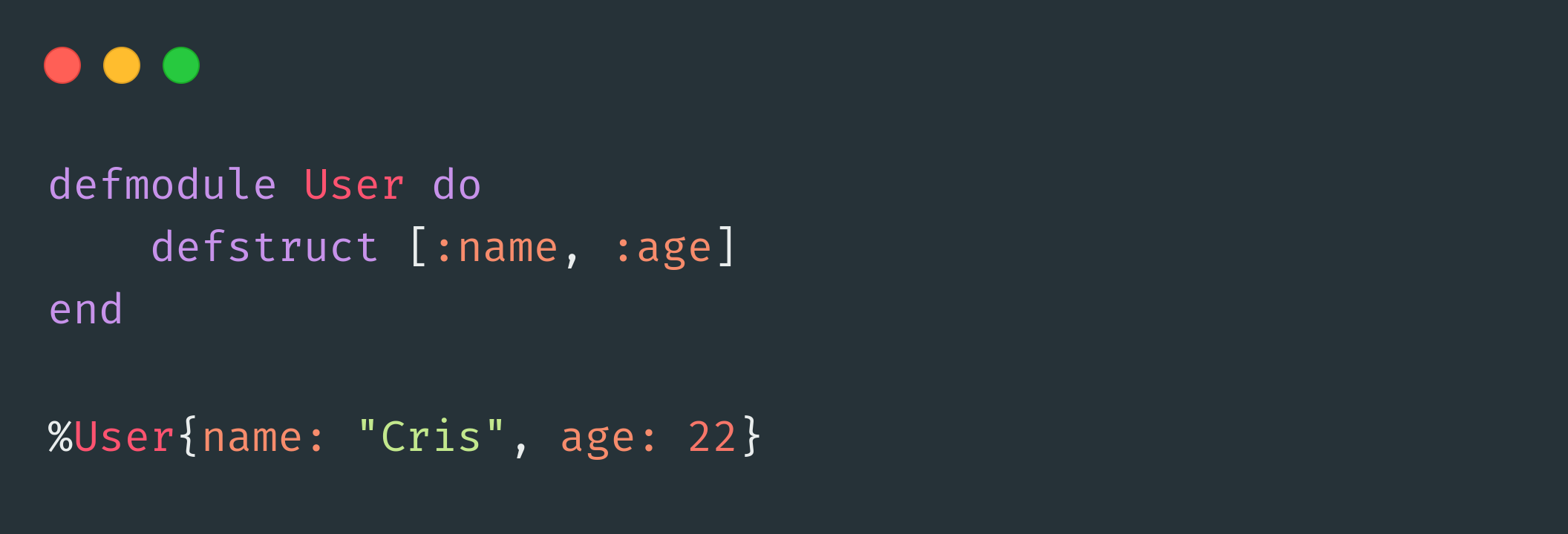 Los structs de Elixir son como los structs de C. No son más que mapas que deben de contar con una serie de claves predefinidas. Se pueden crear con valores por defecto y no permiten añadir nuevas claves en tiempo de ejecución.