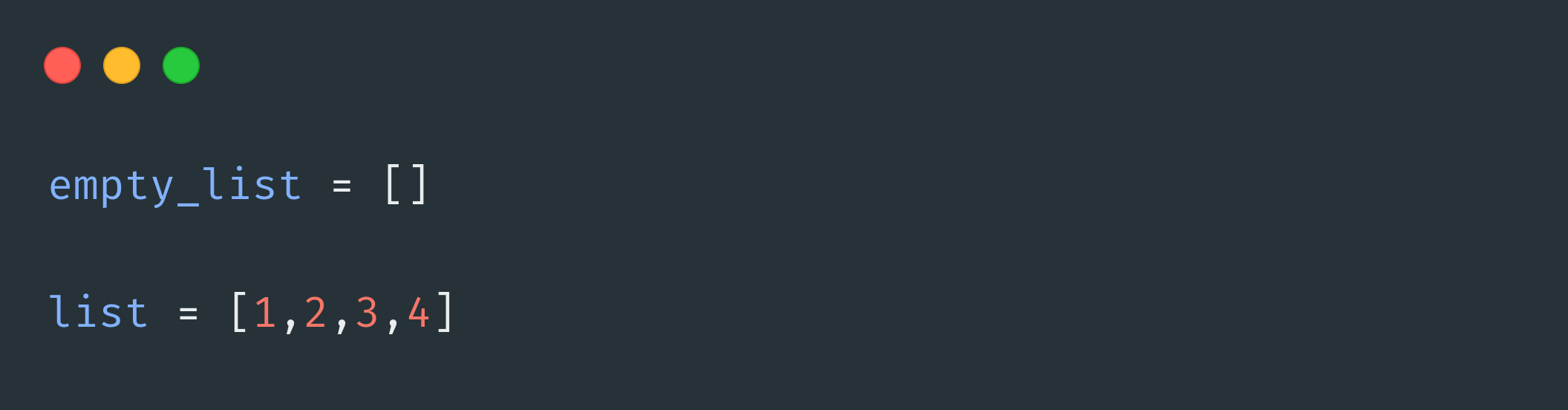 Una lista consiste en lo que todos ya sabemos, almacenar valores entre corchetes separados por comas.
