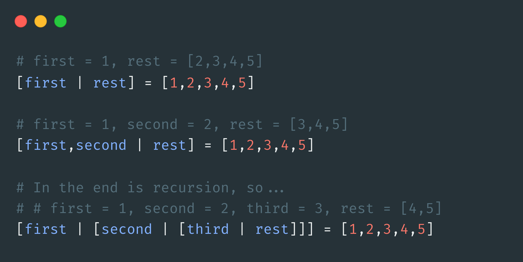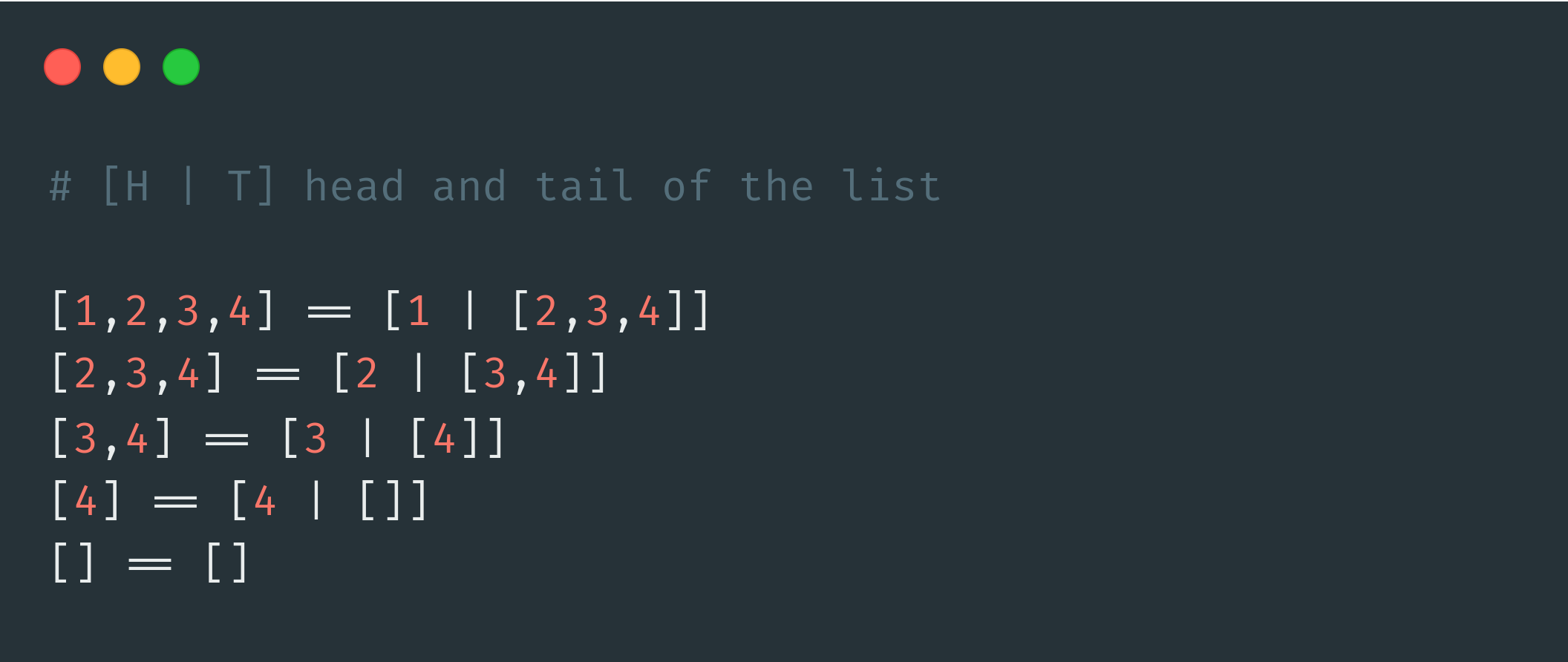 La cabeza de la lista, es decir, su primer elemento, siempre será el primer elemento que nos encontremos en esta, y la cola, su segundo elemento, será una lista con el resto de valores.