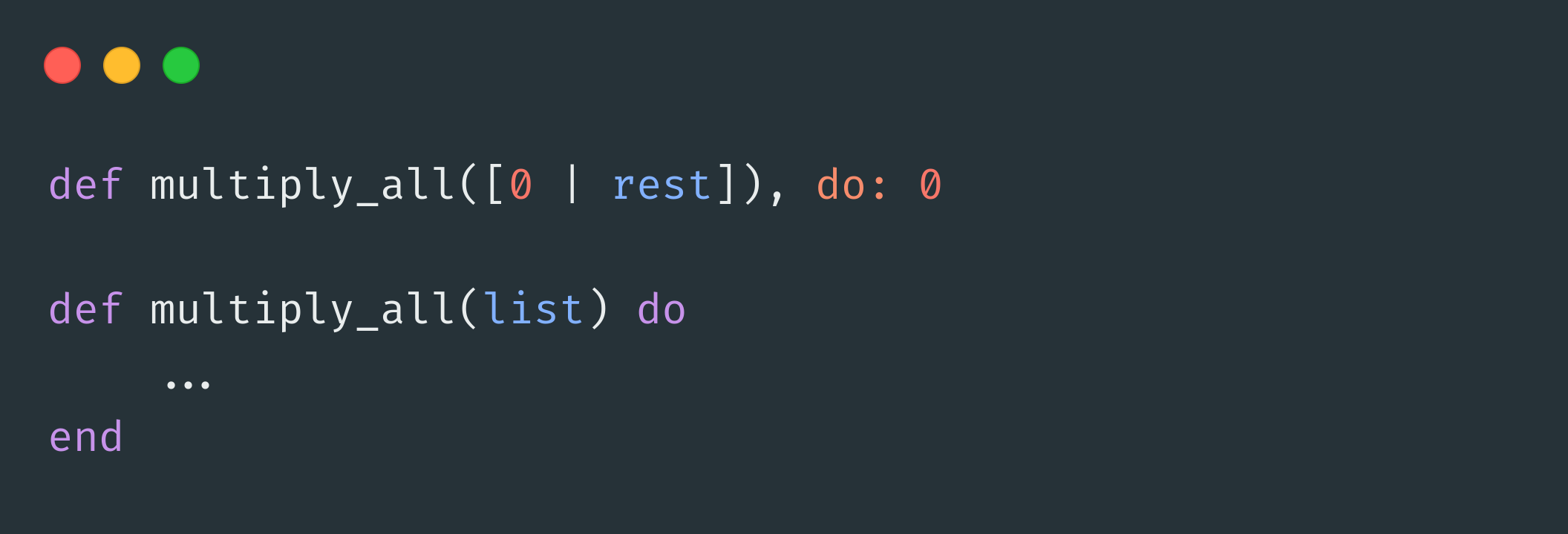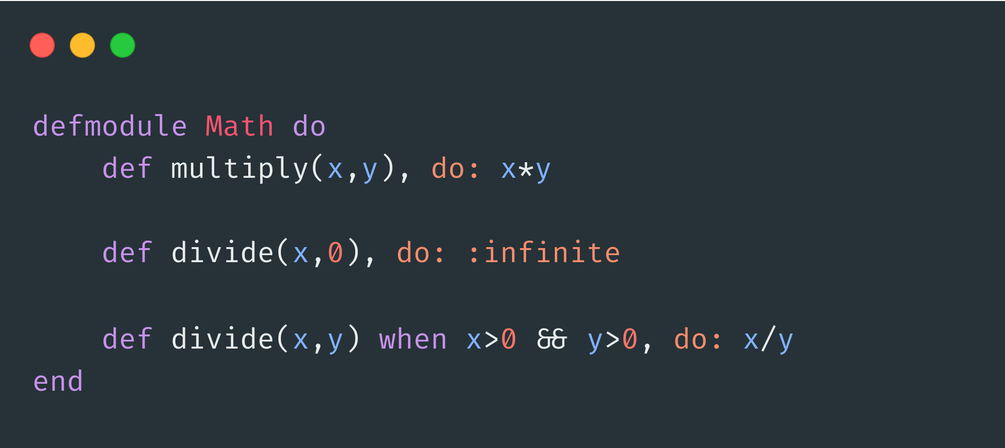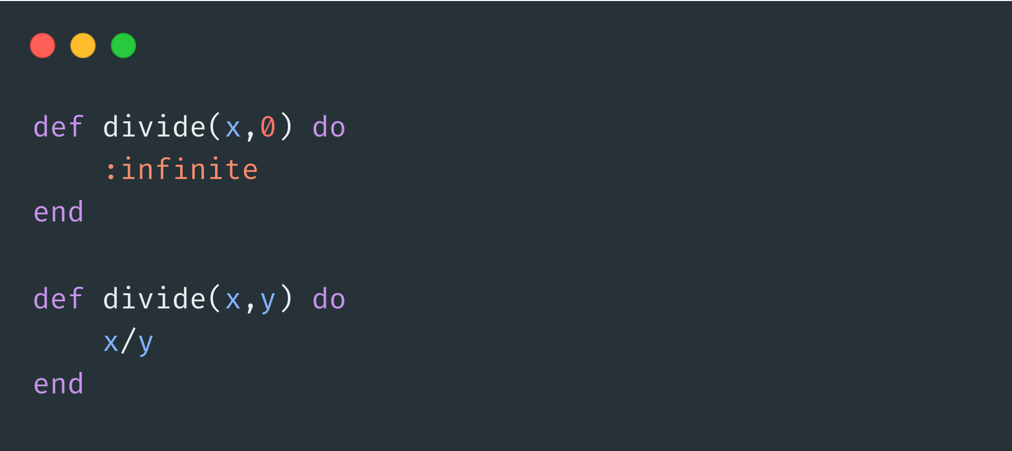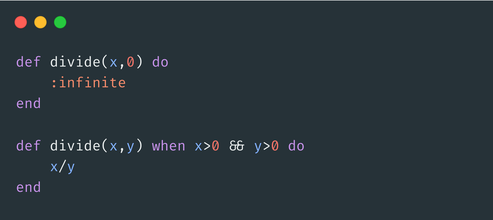 No obstante, Elixir tiene una solución para esto. Si quisiéramos implementar una función para dividir dos números, no sería descabellado querer poner un sentencia if al principio de la función para comprobar que el denominador es mayor que 0.