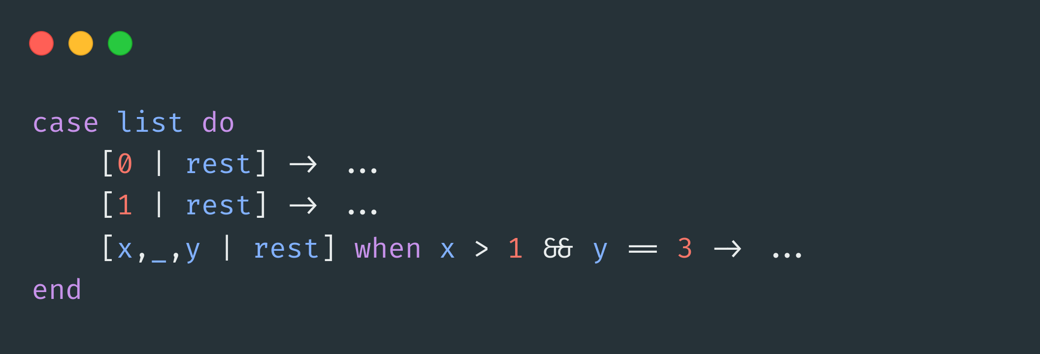 Como puedes ver, las guardas también se pueden aplicar a los casos del operador case. Y respecto a la barra baja, se utiliza para indicarle al compilador que esa variable no es de ninguna importancia para nuestro “match”.
