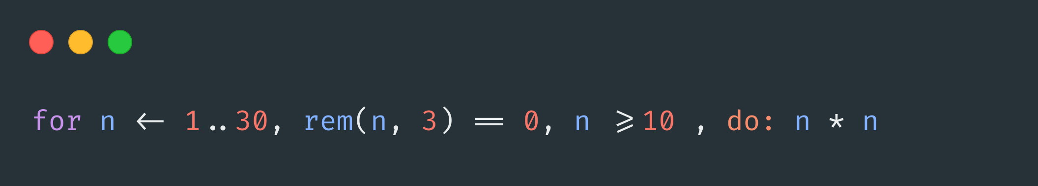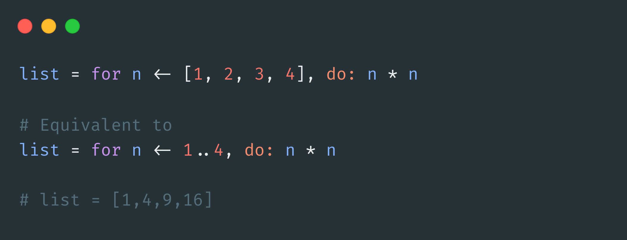Otra herramienta que nos da Elixir para trabajar con listas son las list comprehensions. Las list comprehensions son estructuras que juntan las funciones map y filter en una sola mediante azúcar sintáctico debido a que es usual usarlas juntas.