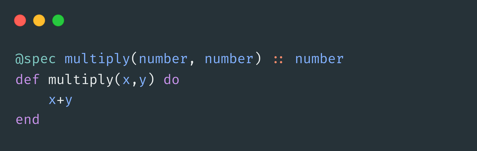 Si has llegado hasta aquí, quizá te preocupe el no ver ninguna definición de tipos de datos en las cabeceras de las funciones. Elixir es un lenguaje con un tipado dinámico y fuerte, como Python o Ruby. Y al igual que Python, Elixir permite tipar las cabeceras de las funciones mediante anotaciones.