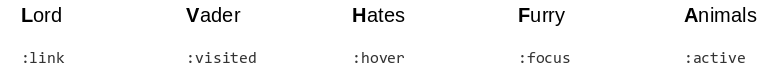 Son selectores que dependen no de la estructura del elemento, sino de su estado (si está clickado, si tiene el cursor encima, si tiene el foco en él, etc.). Una regla para recordarlos puede ser la siguiente: