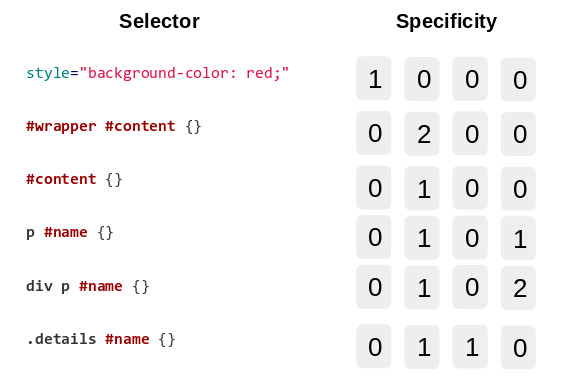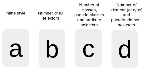 La especificidad es un valor numérico que indica cuán preciso es un estilo. Mientras mayor sea ese valor para un estilo, más prioridad tiene de cara al resto de estilos para aplicarse finalmente. Para calcular la especificidad se tienen en cuenta cuatro variables: