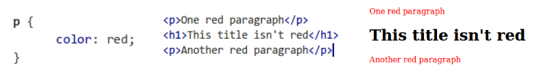 Los más comunes son los type y descendant selectors. Los selectores de tipo se usan para seleccionar un tipo particular de elemento (un p, h2, span, etc.). También son conocidos como selectores de element. Por ejemplo, así podemos hacer que todos los párrafos sean de color rojo: