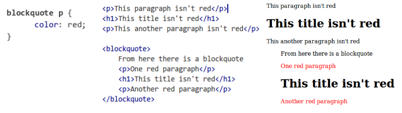 Los descendants selectors permiten seleccionar los descendientes (no nos referimos solo a hijos directos, también pueden ser nietos o estar a cualquier otro nivel, siempre “hacia abajo”en el DOM). Así, todos los párrafos que sean descendientes de un blockquote serán de color rojo, el resto no: