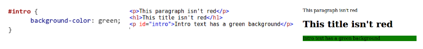 Como el nombre sugiere, los selectores de ID y clase seleccionan un elemento según el valor de sus atributos ID y class. En CSS, denotamos una ID usando el carácter hash (#) seguido del ID, y para denotar una clase usamos un punto (.) seguido del nombre de la clase. En el siguiente ejemplo, solo los elemento con id=”intro” tendrán el fondo de color verde.
