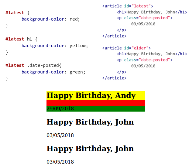 Podemos combinar selectores de distintos tipos para conseguir más precisión. Por ejemplo, solo los elementos de tipo h1 cuyo padre tenga id=”latest” serán de color rojo. Si el elemento es de tipo h1 pero su padre tiene id=”older”, h1 no recibirá ningún estilo.