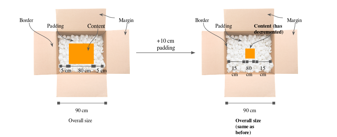 Imagina que una caja CSS es cualquier caja que usan en las fábricas para embalar algún artículo. Las paredes de la caja actúan como el borde y dan definición visual, mientras que el padding es el corcho que colocan alrededor del artículo para protegerlo de posibles golpes. Si es necesario que la caja tenga un tamaño total fijo (porque haya un espacio limitado en el camión de transporte), añadir corcho (padding) o grosor (borde) a la caja, nos obliga a que el artículo que hay dentro deba ser más pequeño para mantener el tamaño total de la caja intacto. Esto sería lo mismo que aplicar box-sizing: border-box en CSS, como podemos ver en la siguiente imagen