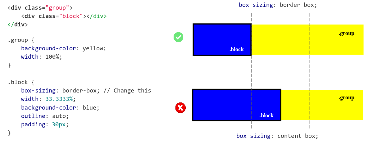 Como podemos ver en la imagen, content-box aplica el 33% al contenido de la caja, por lo que si en algún momento cambiamos el padding (y/o el borde), el tamaño global de la caja va a cambiar, dando un resultado no esperado. Sin embargo, con border-box, el tamaño 33% se refiere al tamaño global, por lo que si en algún momento cambiamos el padding (y/o el borde), el tamaño global de la caja no cambiará, obteniendo el resultado deseado.