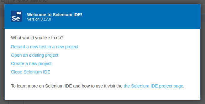 Otra forma es habiendo elegido la opción Record a new test in a new project del recuadro que nos aparece al abrir Selenium IDE, donde nos pedirá el nombre del proyecto, la URL y, una vez terminada la grabación, el nombre del test.