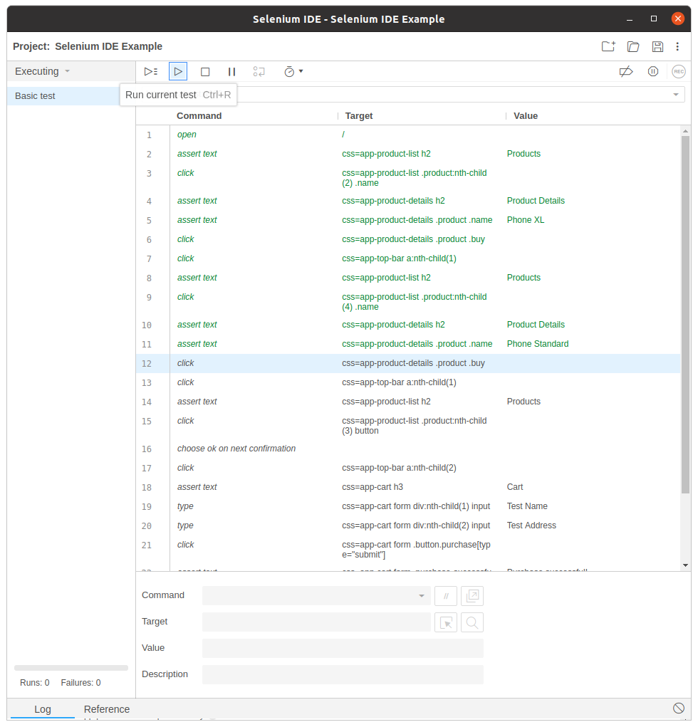 Para ejecutar los tests es tan simple como pulsar el botón de Run test, si queremos ejecutar solo el test actual, o Run all tests, si queremos ejecutar todos los tests que formen parte de un Test suite. Una vez hecho esto, veremos cómo se van ejecutando los comandos.