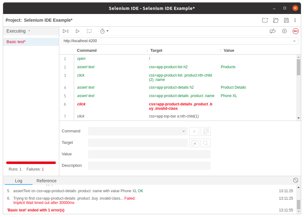 Si no hay ningún error, por ejemplo, que el elemento buscado no se encuentre en el DOM, deberían ponerse en verde las filas de la tabla de comandos. En caso de que hubiese algún problema de timeout o de StaleElementReferenceError, el editor nos lo indicaría poniendo en rojo la fila del comando en cuestión y nos aparecería un log del error en la sección de Log del editor.