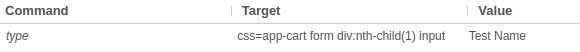 Introduce el texto Test Name en el campo input que se encuentra dentro de primer div, hijo del elemento form en el componente app-cart.