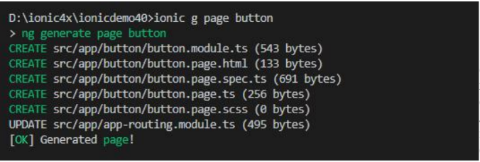 1.1 Crear una página en Ionic v4 es similar a crearla en la v3. Sólo tienes que utilizar la sintaxis “ionic g page nombrePagina”, como se muestra en en la figura 1-1. En el ejemplo crearemos una página llamada «button».