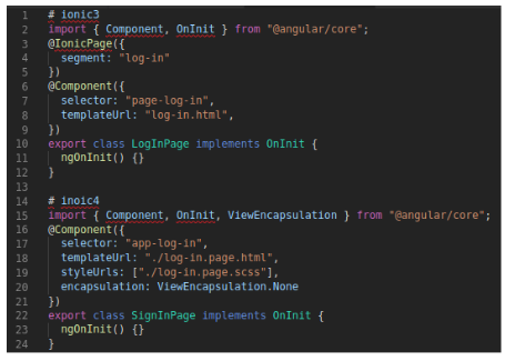 En general las diferencias no son tan grandes, siendo la principal la parte «@Component», el nombre del selector, la referencia del archivo plantilla y el archivo de estilo. La parte «@IonicPage» de la versión 3 ha sido eliminada en la 4, y algunas funciones están colocadas en Angular router.