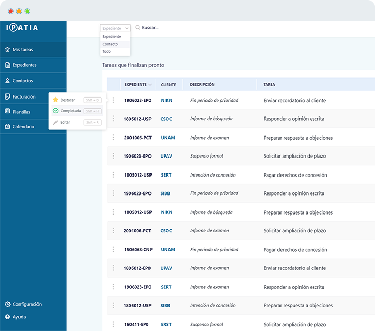 IPatia incluye un listado de gestión de tareas que permiten controlar, de forma sencilla, todos los vencimientos de los expedientes, ordenados por fecha, responsable, familia, patente o cliente. De ese modo, es posible identificar fácilmente cualquier tarea pendiente, definir su prioridad/urgencia y/o asignársela a un miembro del equipo del usuario. IPatia permite, además, programar recordatorios internos o externos respecto a cualquier tarea o vencimiento.