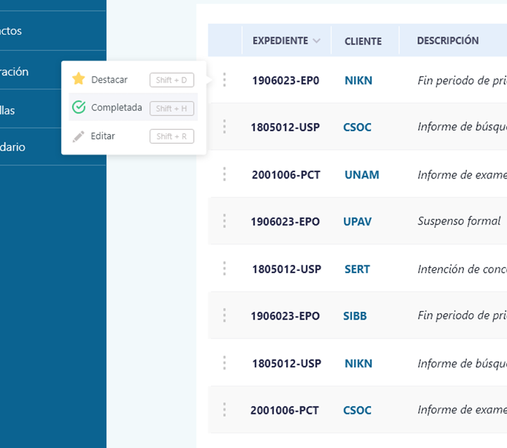 Cada nuevo expediente genera tareas preconfiguradas de forma automática para cualquier país, agilizando enormemente el trabajo necesario para realizar el seguimiento de la tramitación de las patentes.