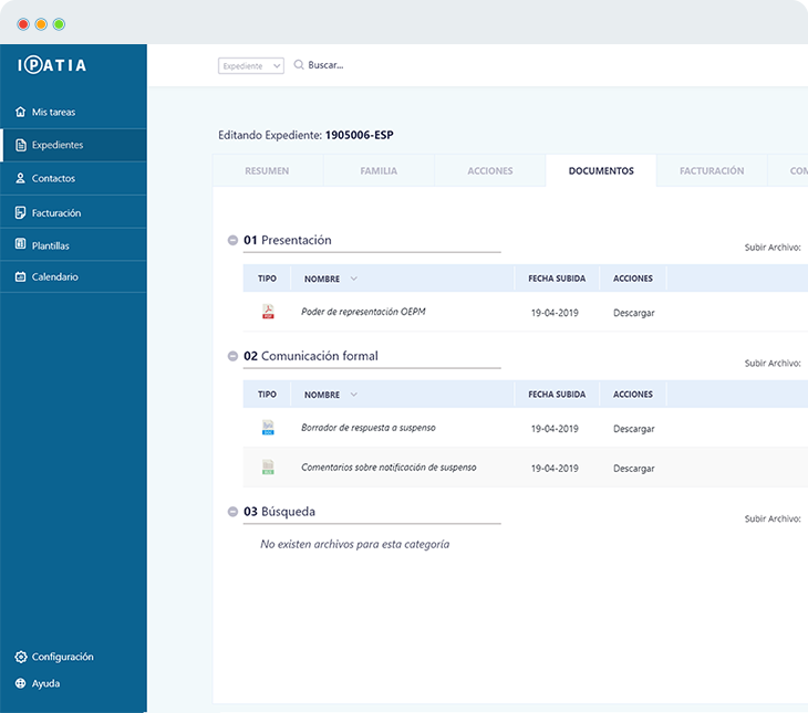 IPatia permite almacenar toda la información de las patentes en la nube, de forma segura y sin necesidad de instalar ningún software. Además, gracias a su gestor de documentos, es posible asociar nuevos archivos a cualquier etapa de tramitación, así como modificarlos o eliminarlos cuando sea necesario.