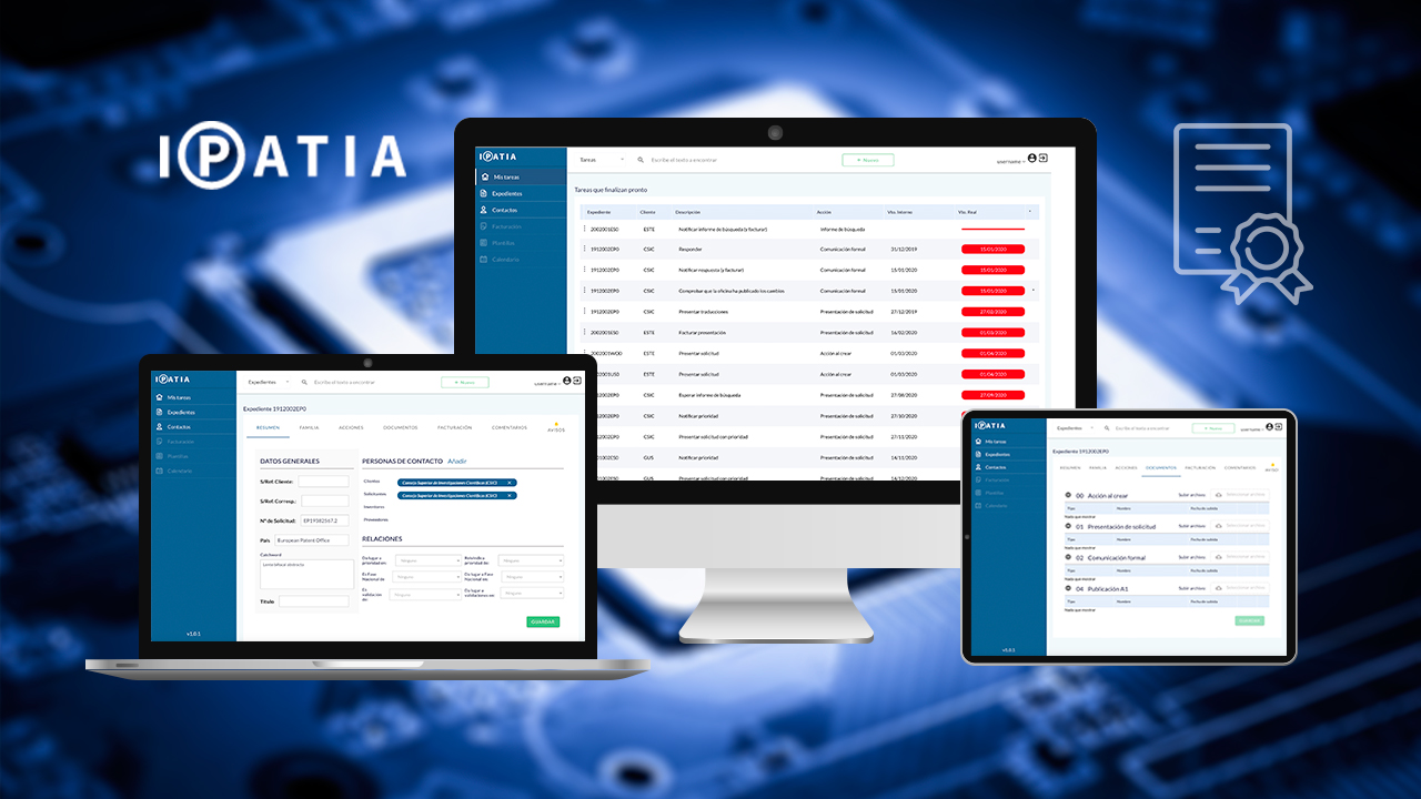 IPatia es una aplicación web destinada a la gestión integral de carteras de patentes y modelos de utilidad. Con ella, es posible controlar de forma detallada grandes portfolios de patentes de cualquier país del mundo, programar las tareas asociadas a dichas patentes y documentar todos los actos de tramitación de las mismas. En este sentido, esta aplicación web se ha desarrollado para realizar un seguimiento detallado y ágil de las patentes de nuestros clientes. Pero también tenemos previsto, con el avance de su desarrollo, ofrecer la plataforma como solución comercial en los próximos meses para agencias de propiedad industrial, empresas innovadoras, organismos de investigación o universidades, entre otras.