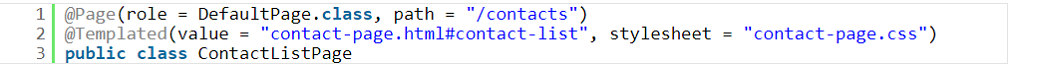 Con la anotación @Templated, se indica la plantilla html que queremos utilizar. Sólo las páginas con anotación @Templated, o las clases implementadas con IsWidget directa o indirectamente, pueden tener la anotación @Page. Otras anotaciones se utilizan para llamar a métodos específicos de los eventos de las páginas.